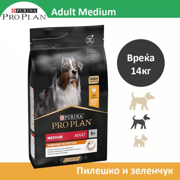 • Pro Plan Medium ADULT Сува храна за Возрасни кучиња од Среден раст со Пилешко [Вреќа 14кг]