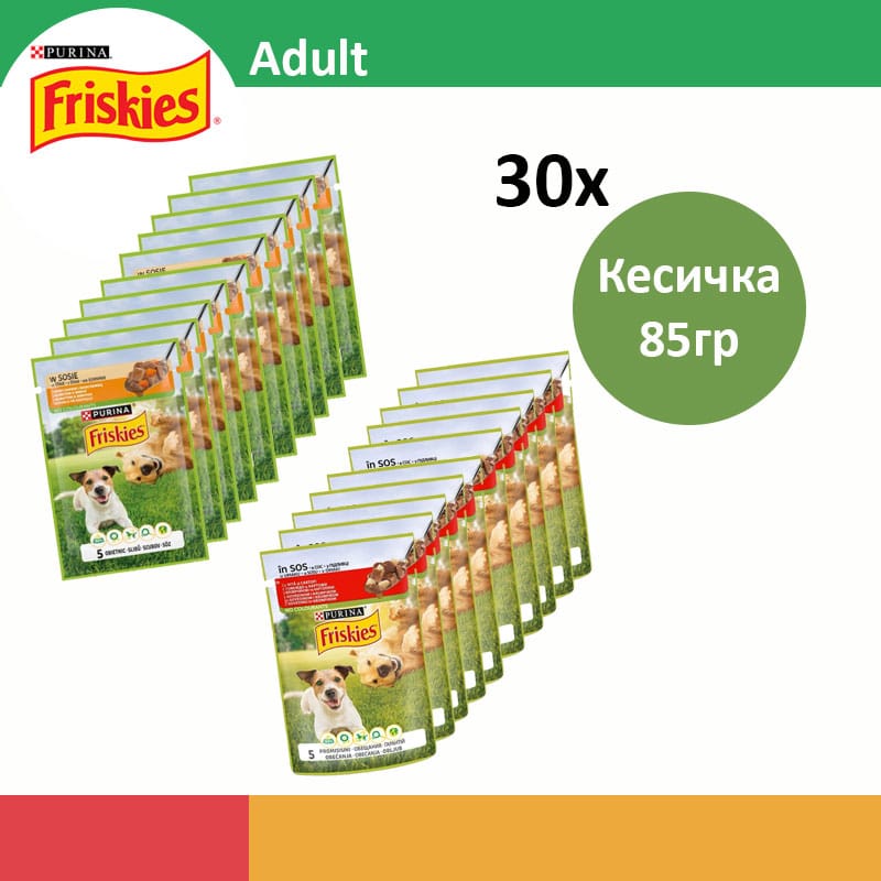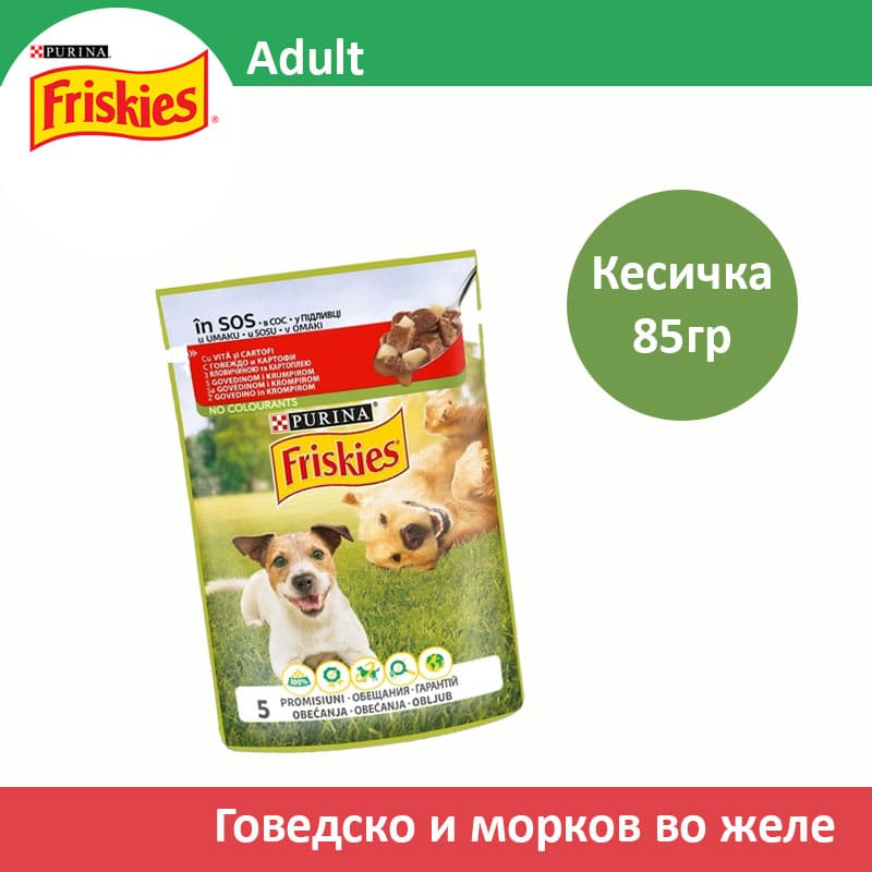 Friskies Adult Влажна храна за Возрасни кучиња со парчиња Говедско и морков во желе [Кесичка 85гр]