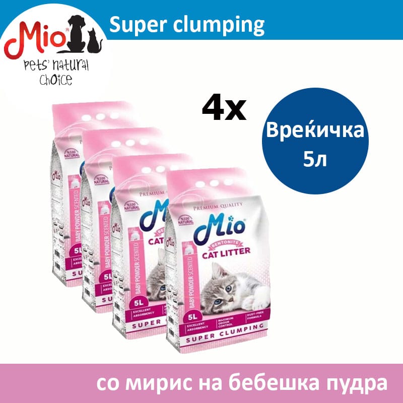 Mio Super Clumping Песок за мачки со мирис на Бебешка пудра СЕТ 4х [Вреќичка 5л]