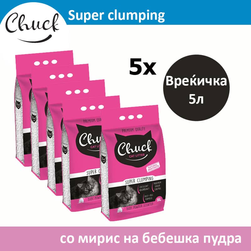 Chuck Clumping Песок за мачки со мирис на Бебешка пудра СЕТ 5х [Вреќичка 5л]